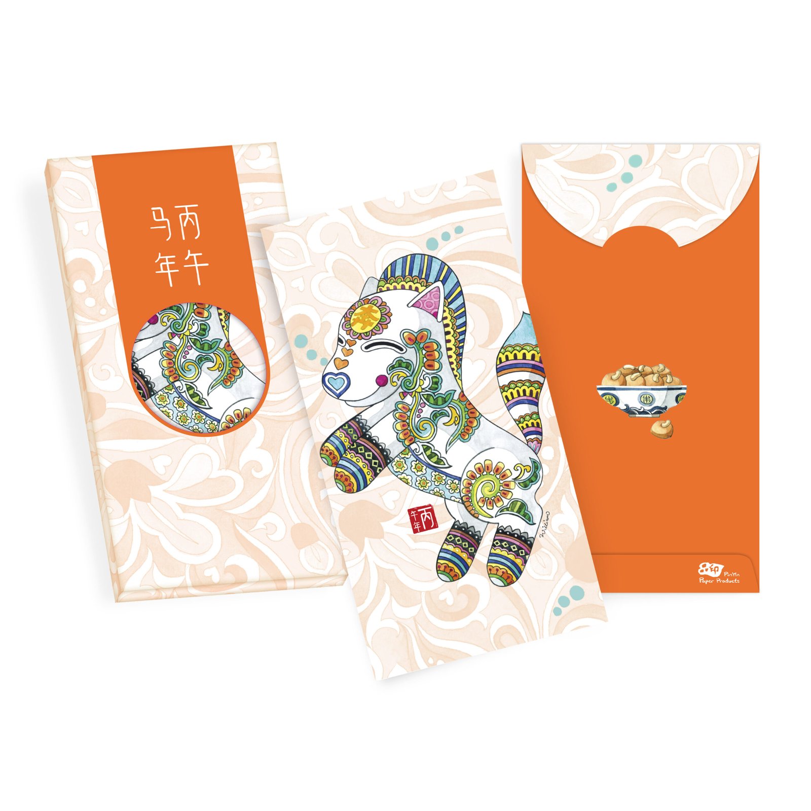 - Printed on premium quality paper, each pack contains 8 pcs of Horse Zodiac Hong Bao featuring a warm and majestic white horse clad in whimsical tattoos and gypsy-inspired hooves, presented in a decorative holder.